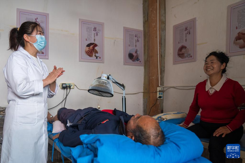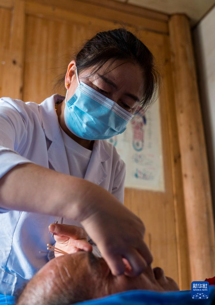 4月17日,黄爱玲在中和镇大村社区卫生所为病人治疗。新华社发(彭奕凯摄)