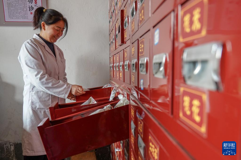 4月18日,黄爱玲在中和镇大村社区卫生所为病人拿药。新华社发(彭奕凯摄)