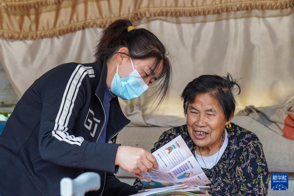 4月17日,黄爱玲(左)在中和镇大村社区卫生所与村民交谈。新华社发(彭奕凯摄)