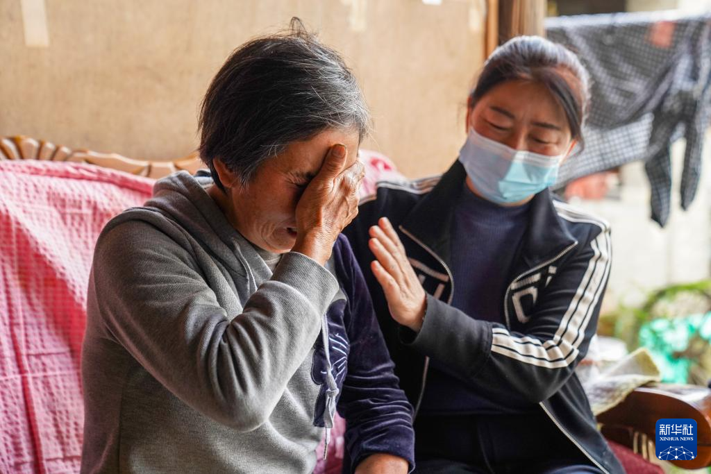 4月18日,黄爱玲在患者家中随访时,聊起昔日受到黄爱玲的帮助,患者感动落泪。新华社发(彭奕凯摄)