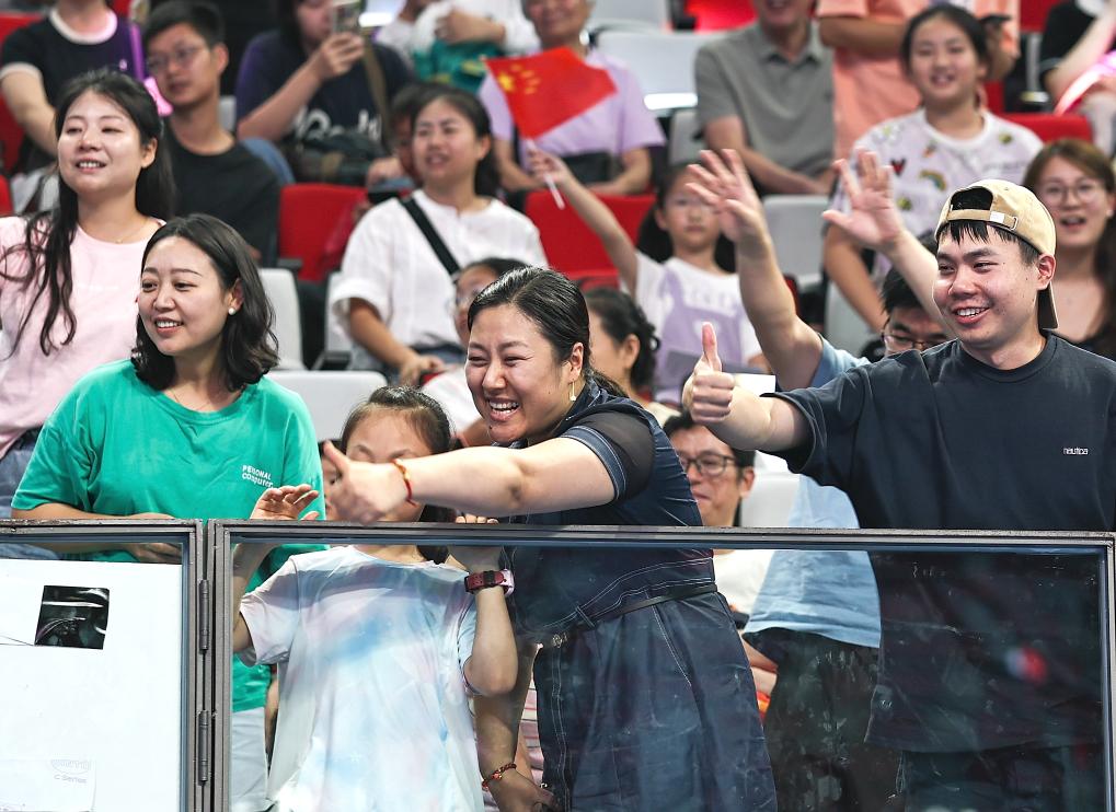 8月10日,观众向中国组合胡译乘/张欣欣点赞。新华社记者 孙凡越 摄