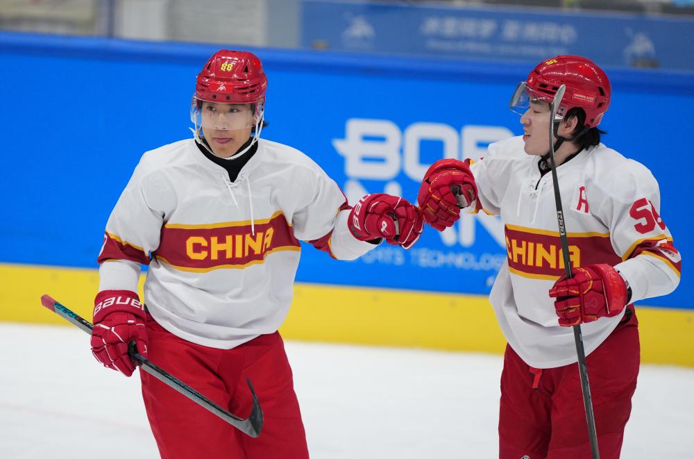 2月7日,中国队球员闫俊丞(左)在比赛中与队友庆祝进球。新华社记者 孟永民 摄