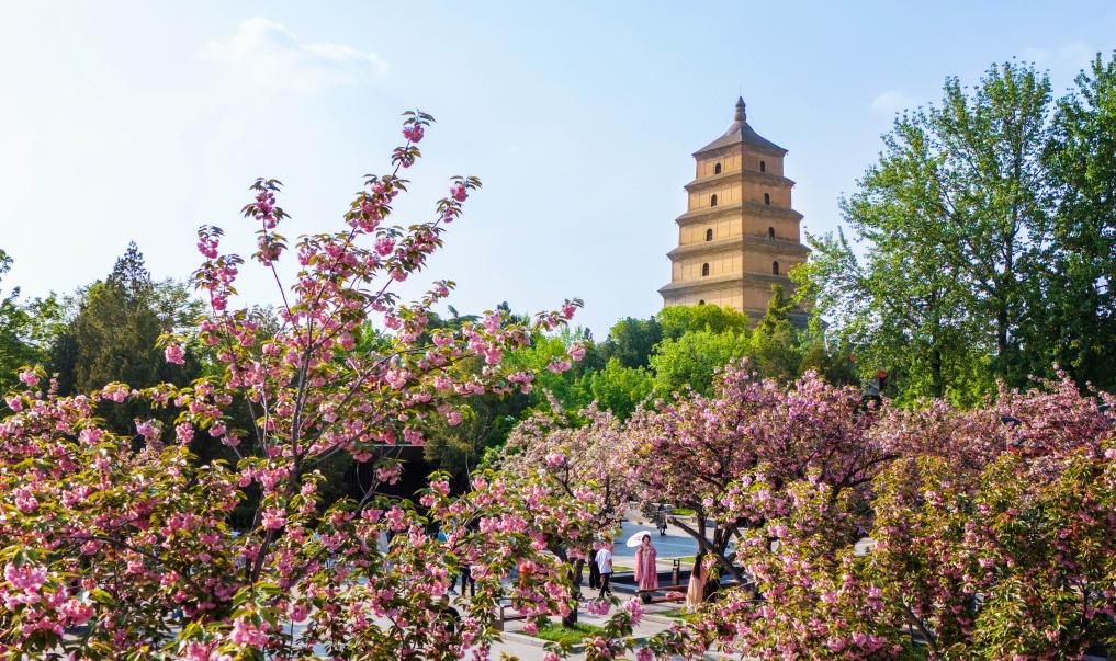 游客在西安大雁塔下游览(无人机照片,2024年4月10日摄)。 新华社记者 邹竞一 摄