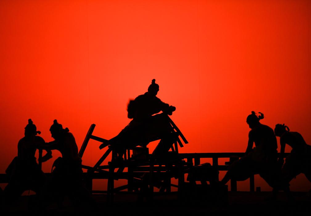 这是以“云梦睡虎地黑夫木牍”为灵感创排的大型历史舞台剧《赳赳大秦》演出现场(2024年9月25日摄)。 新华社记者 张博文 摄