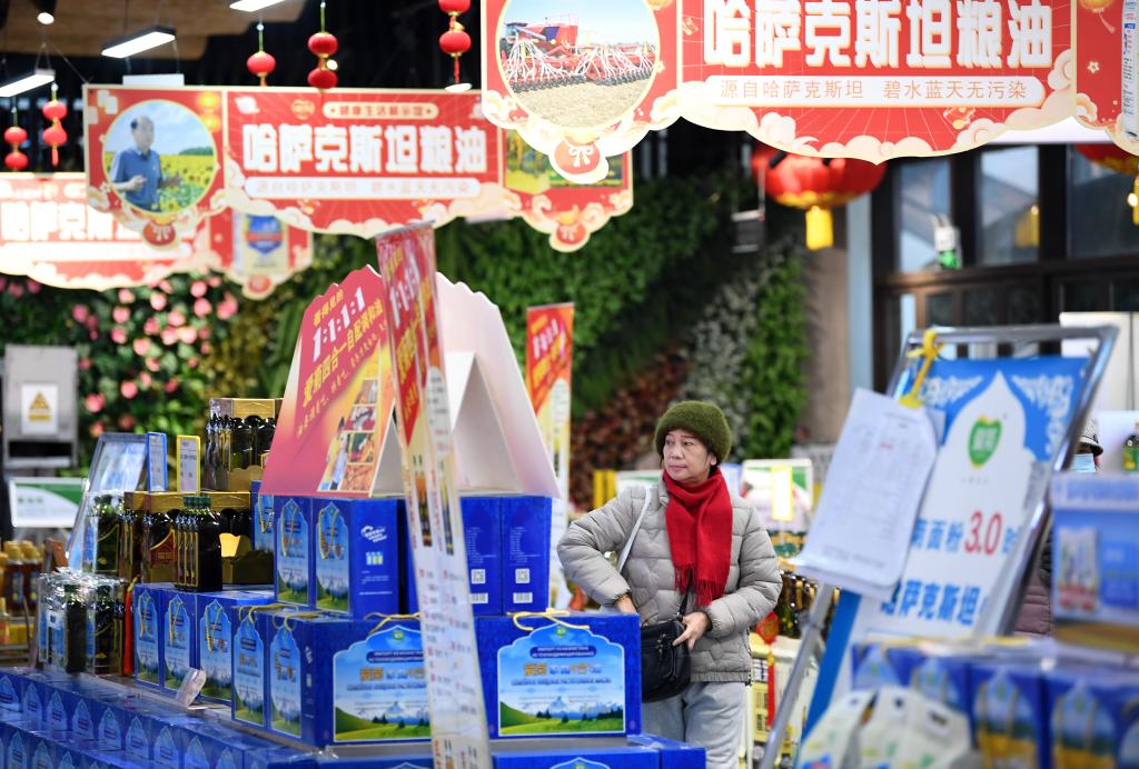 消费者在“中欧班列(西安)进口商品年货节”上挑选哈萨克斯坦粮油产品(2024年2月1日摄)。 新华社记者 李一博 摄