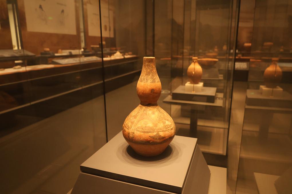 踏入博物馆,一只彩陶葫芦瓶吸引了人们的目光——这件红陶制品的颈部上方有对称分布的圆形几何图案,瓶腹位置则勾画着由圆点、弧线和三角等组成的酷似人面的细腻纹饰。与其他彩陶器对比,陶器上的纹路显得尤为特别。