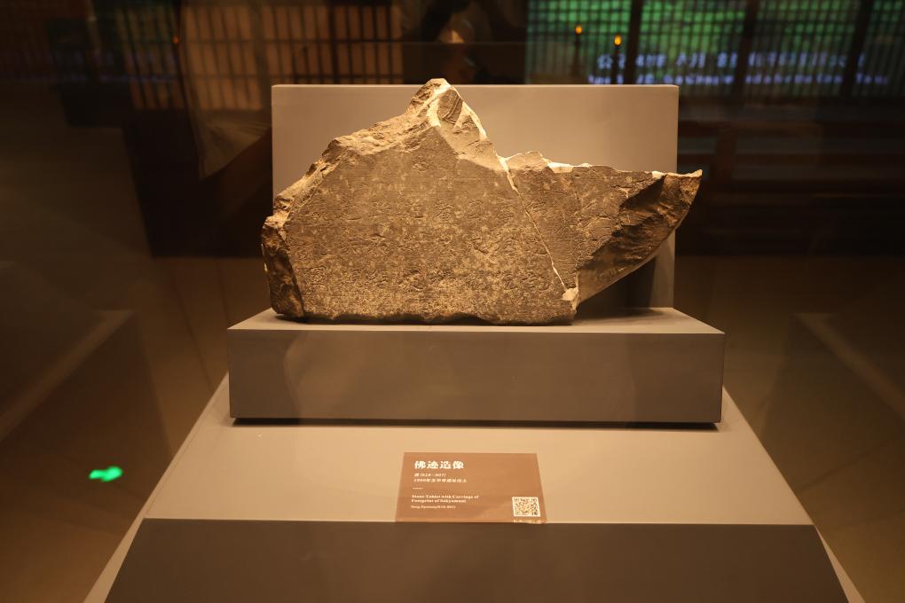 在“玉山金容”展区的最中央处,展陈着一块由三块碎片拼接而成的残石。“这是铜川博物馆的‘镇馆之宝’——玄奘造佛迹造像。”史苗介绍道,“器物顶部残有凸起的宝样纹,底部右侧残存有十字形花头,花头左侧为阴刻21字楷书发愿文,该段文字应是玄奘法师在玉华寺敬造的佛足印石的文字题记部分,是玄奘法师的亲笔铭文。”