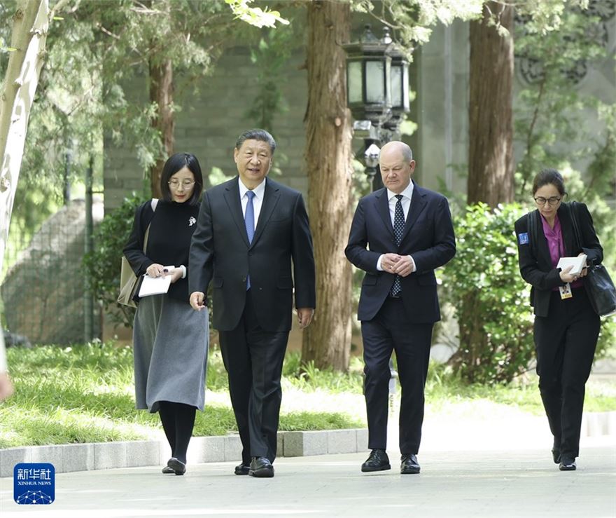 4月16日上午,国家主席习近平在北京钓鱼台国宾馆会见德国总理朔尔茨。这是习近平同朔尔茨合影。