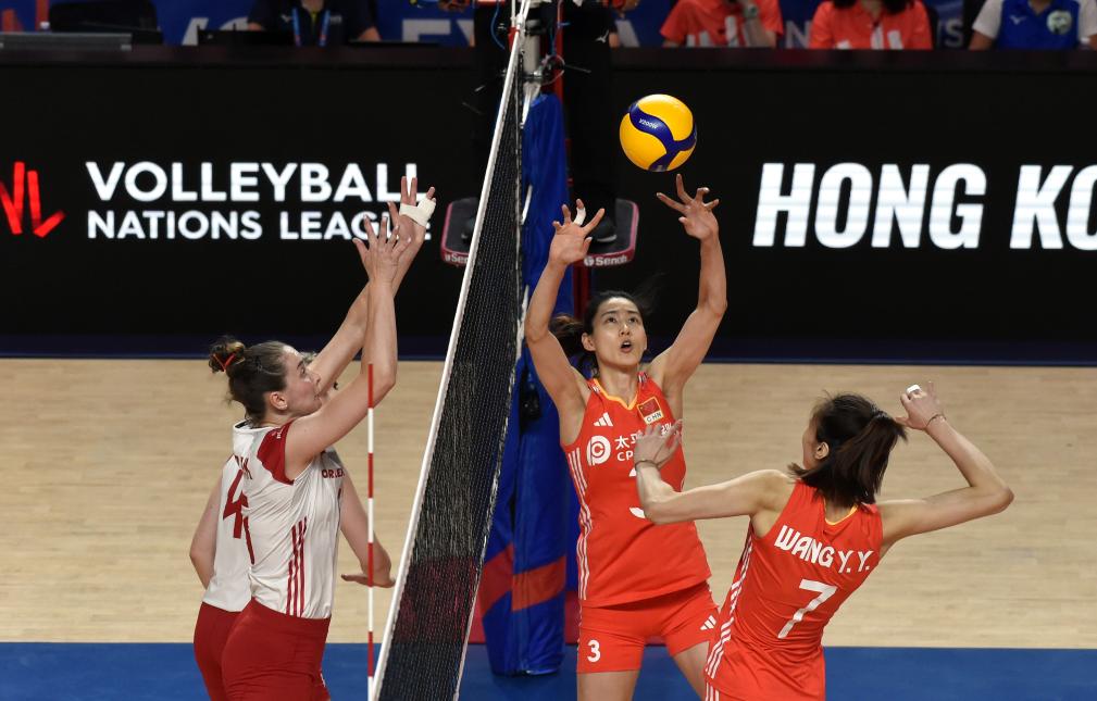 6月16日,中国队球员刁琳宇(右二)在比赛中传球。当日,在世界女排联赛中国香港站比赛中,中国队3比0战胜波兰队。新华社记者 卢炳辉 摄