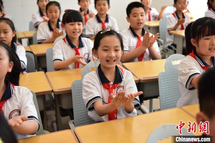 4月24日,安平县第五小学的学生们在教室内表演课桌舞。李彦超 摄