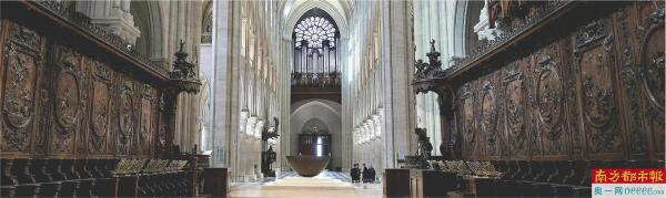 修复后 2024年11月29日摄对比火灾前,巴黎圣母院内部更加明亮,尽头上方是巨型管风琴。
