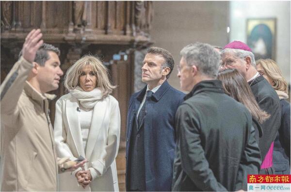 11月29日,法国总统马克龙(左三)在巴黎圣母院内了解修复情况。