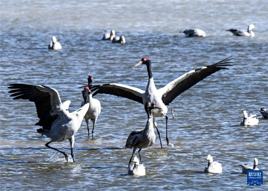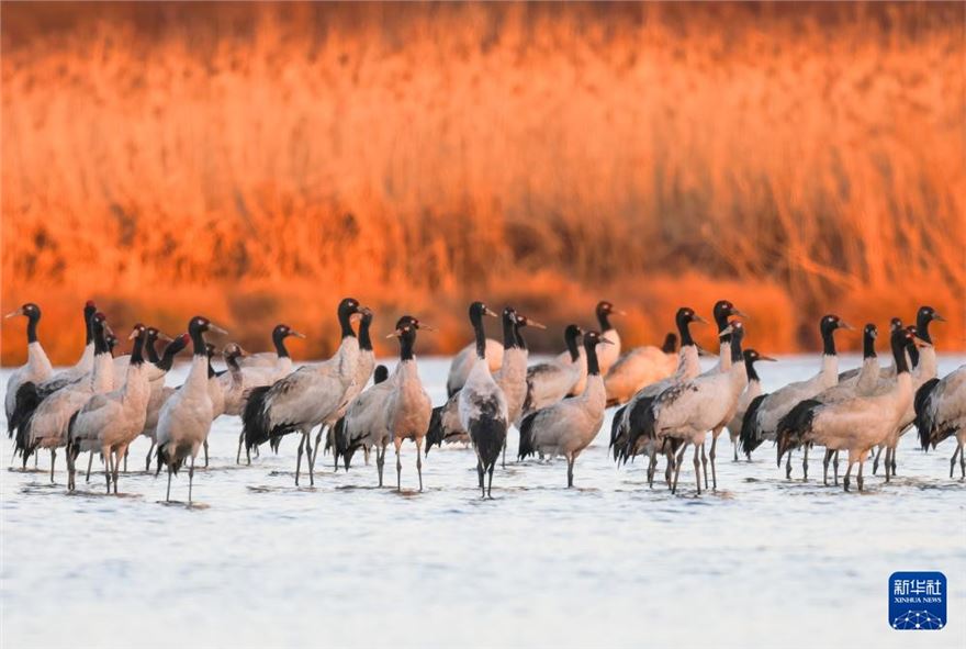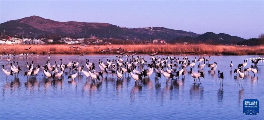 冬日,地处贵州省毕节市威宁县的草海国家级自然保护区呈现万鸟翔集的生态美景,黑颈鹤、灰鹤以及斑头雁等大批候鸟来此越冬。