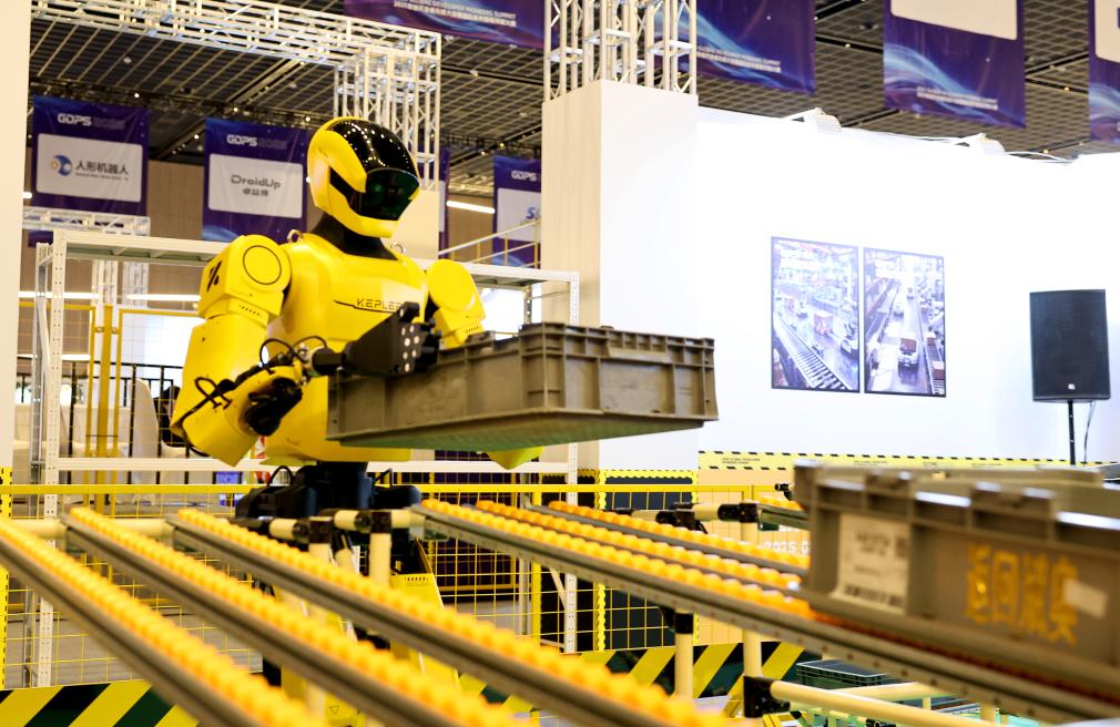 2025年12月12日,机器人在工厂搬运竞技场进行货物转运比赛。新华社记者 方喆 摄
