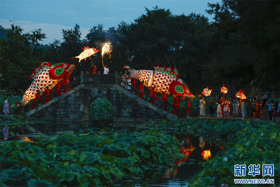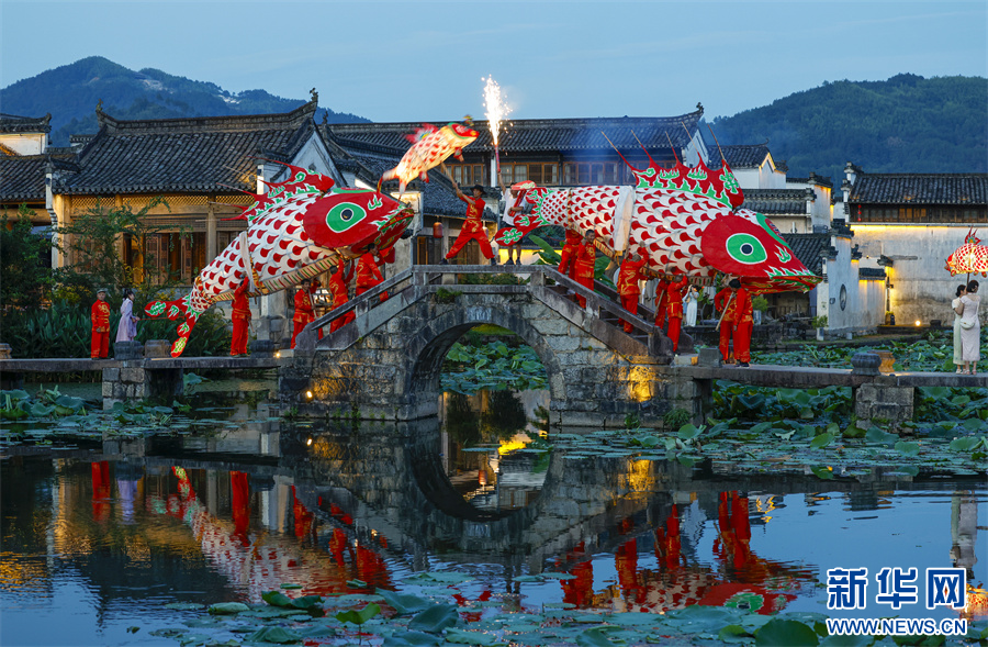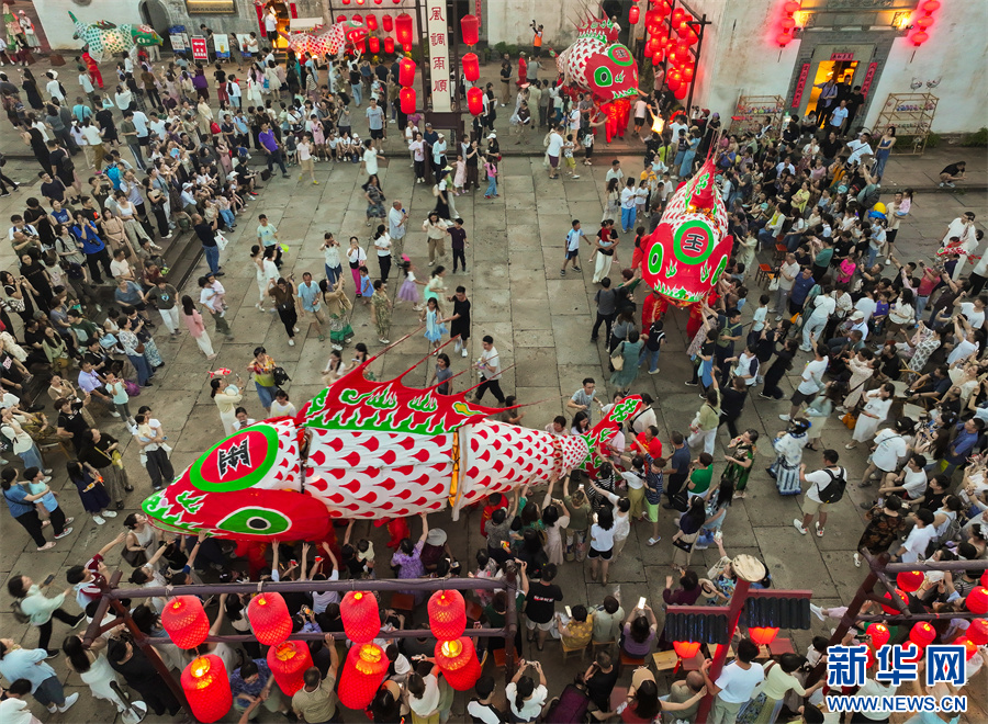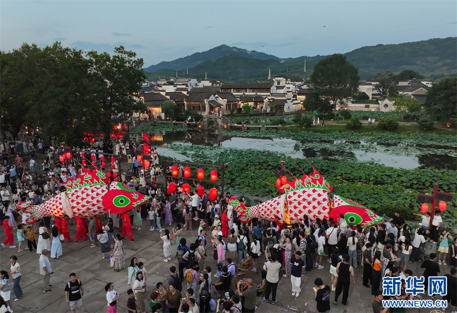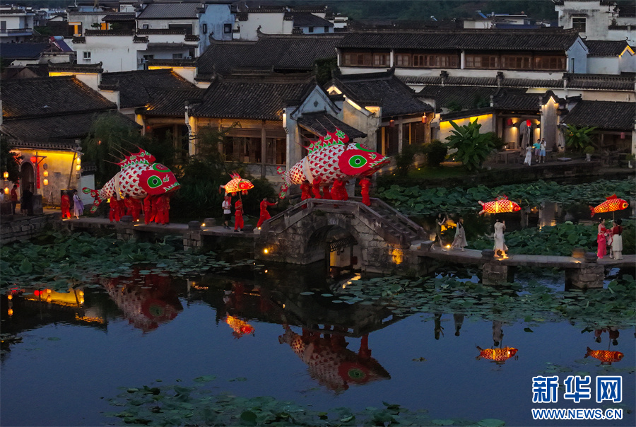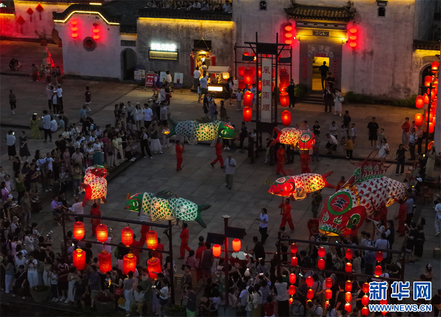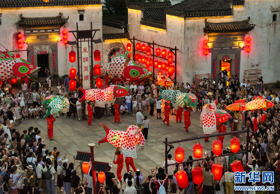 6月30日,游客在安徽省黄山市徽州区呈坎古村落观赏鱼灯表演(无人机照片)。