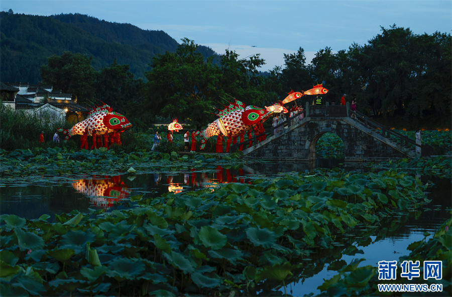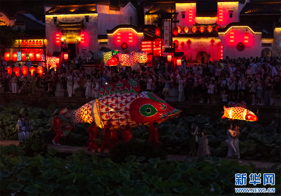 6月30日,鱼灯表演队伍在安徽省黄山市徽州区呈坎古村巡游。