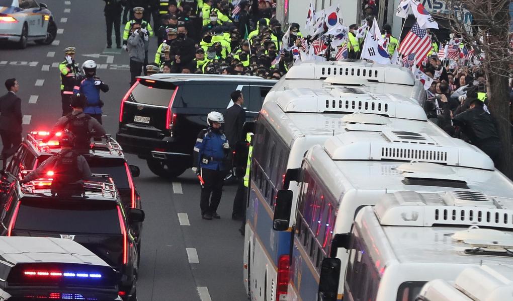 3月8日,尹锡悦乘坐的车辆抵达汉南洞总统官邸入口。新华社记者姚琪琳摄