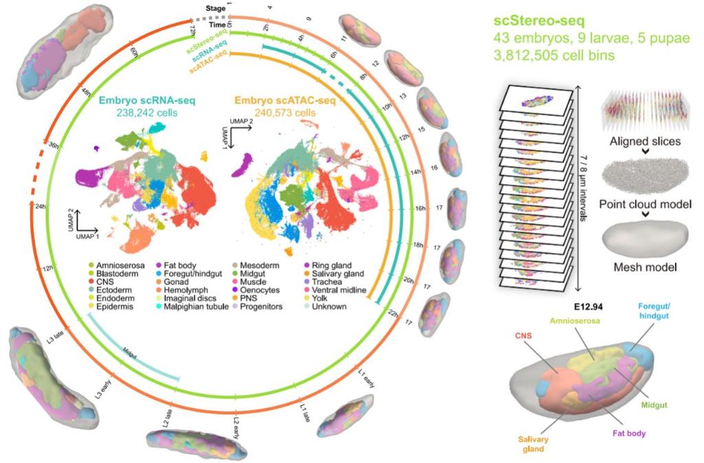 杭州华大生命科学研究院与南方科技大学创建了一个解码动物发育过程的多模态数据集,生成了果蝇全发育周期的3D单细胞时空多组学图谱,为生物发育提供了分子层面的参考,有望为发育缺陷及相关疾病机制研究奠定基础。相关成果26日发表于国际学术期刊《细胞》。