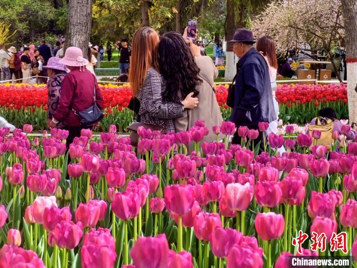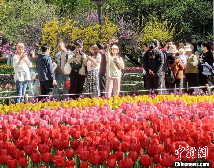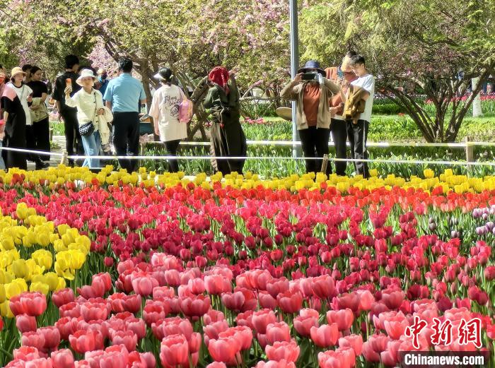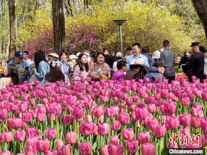图为西宁市人民公园内大片郁金香盛开,吸引游客观赏。祁增蓓 摄