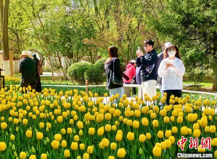 图为西宁市人民公园大片郁金香吸引游客拍照。祁增蓓 摄