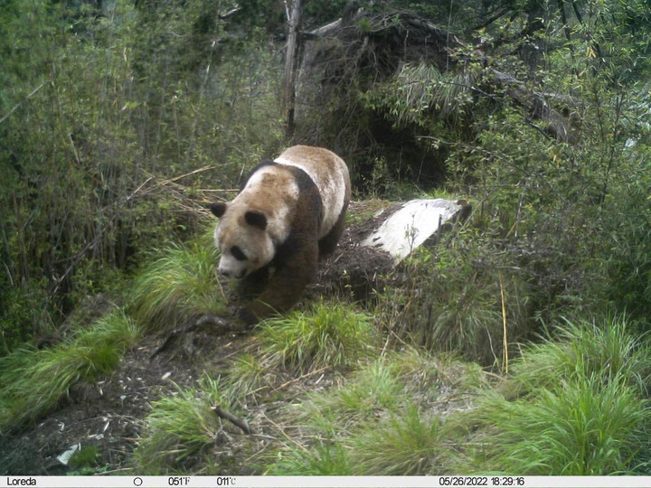 这是大熊猫国家公园唐家河片区白熊坪区域的一台红外相机拍摄到的野生大熊猫画面(2022年5月26日摄)。新华社发(大熊猫国家公园唐家河片区供图)