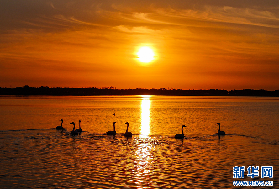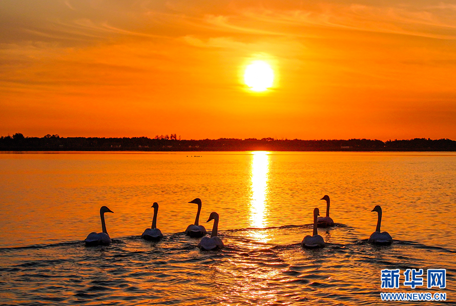 成群的大天鹅聚集在湖面上休憩。新华网(李信君 摄)