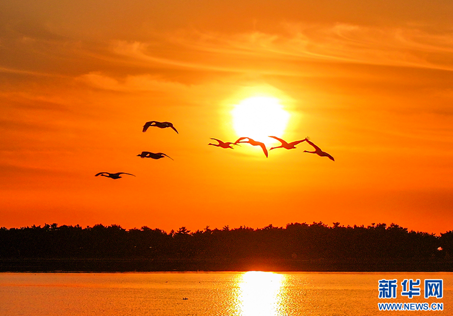 一群大天鹅从天鹅湖区域飞过。新华网(李信君 摄)