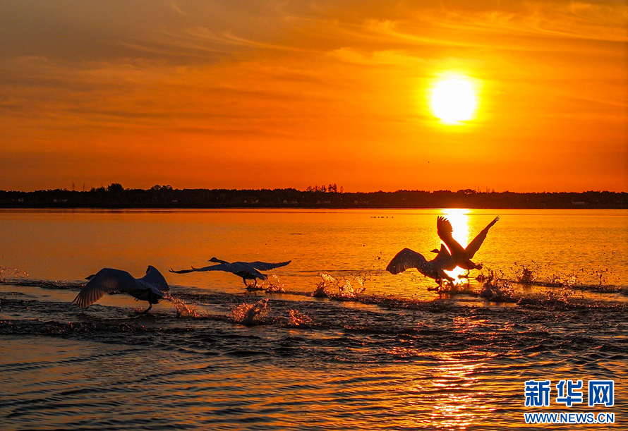 大天鹅在湖面上嬉戏、捕食。新华网(李信君 摄)