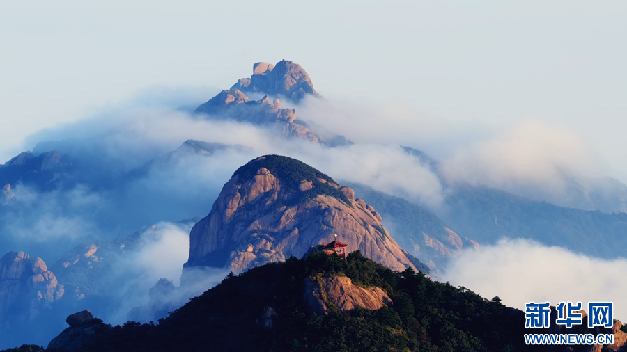 秋日时节,安徽省池州市九华山风景区出现壮丽云海。云涛在山峦间翻涌,巍峨山峰若隐若现,与日出霞光相互映衬,绘就宛如仙境的山水画卷。