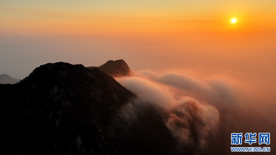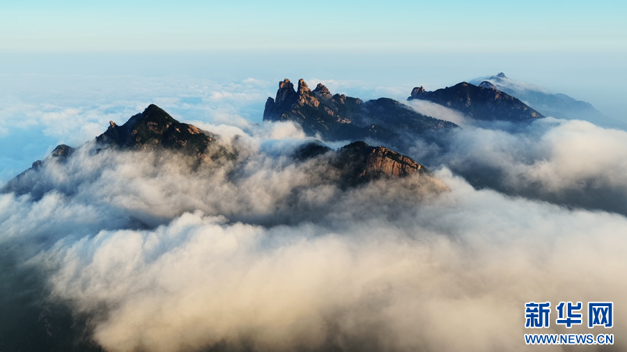 秋日时节,安徽省池州市九华山风景区出现壮丽云海。云涛在山峦间翻涌,巍峨山峰若隐若现,与日出霞光相互映衬,绘就宛如仙境的山水画卷。(陈英杰 王帆)