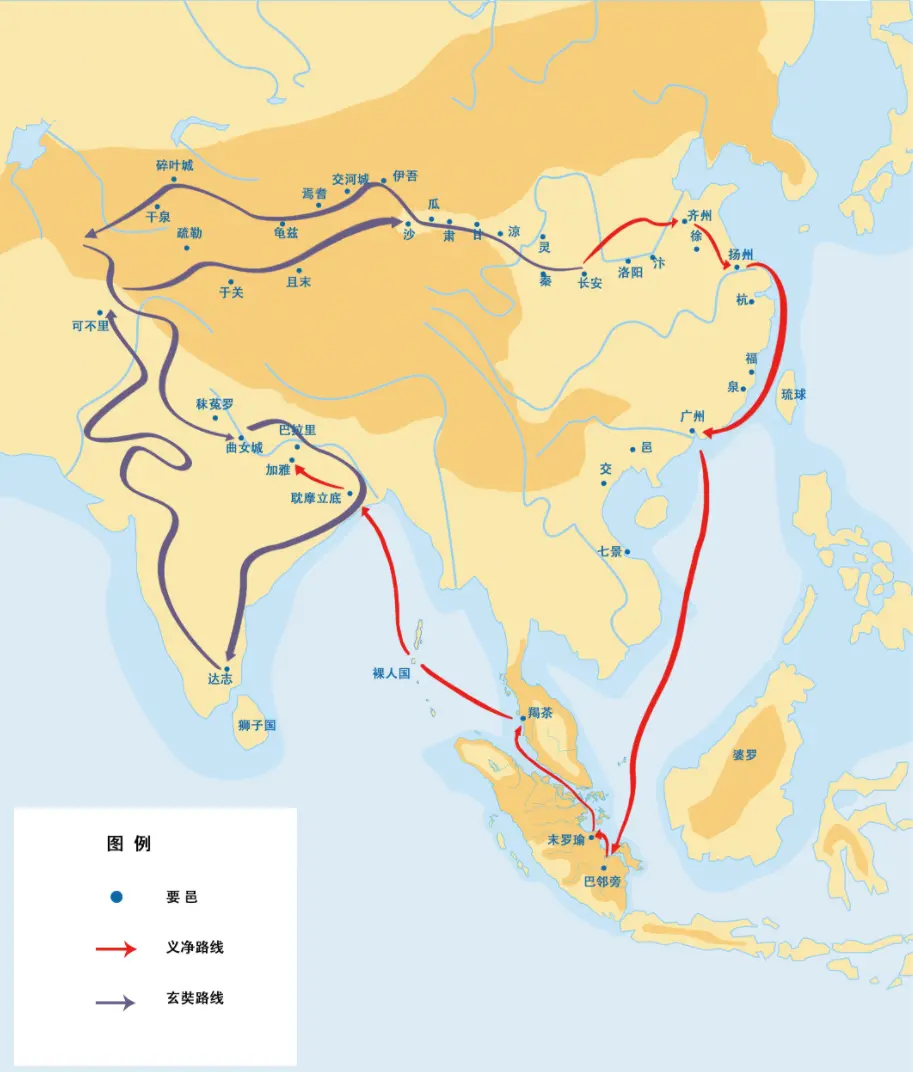 义净法师673年离开了室利佛逝国,往西北行进至印度,至此途中遭遇几次重大风险,险些丧命。过去的沿海航行技术水平有限,遇到暴风雨或是大浪几乎是九死一生,遑论途中遭遇疾病、强盗,更是时时刻刻威胁着求法人的生命,“长截洪溟,似山之涛横海;斜通巨壑,如云浪之滔天。”