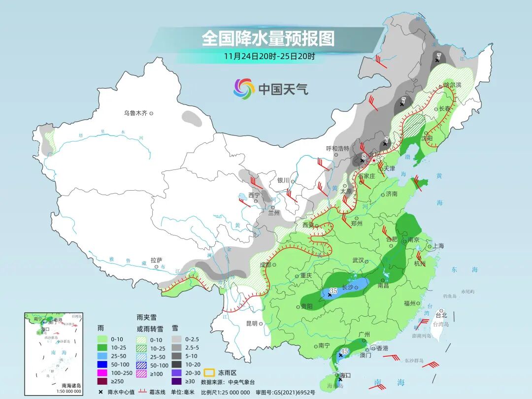 11月24日晚上到25日白天,阴天有小雨,湘北、湘中部分地区有中雨,其中怀化北部、常德西南部、益阳西部、娄底北部、长沙西部局地大雨;北风4~5级,局地阵风7~8级;最低气温8~10℃;最高气温湘西11~13℃,其他地区13~15℃。