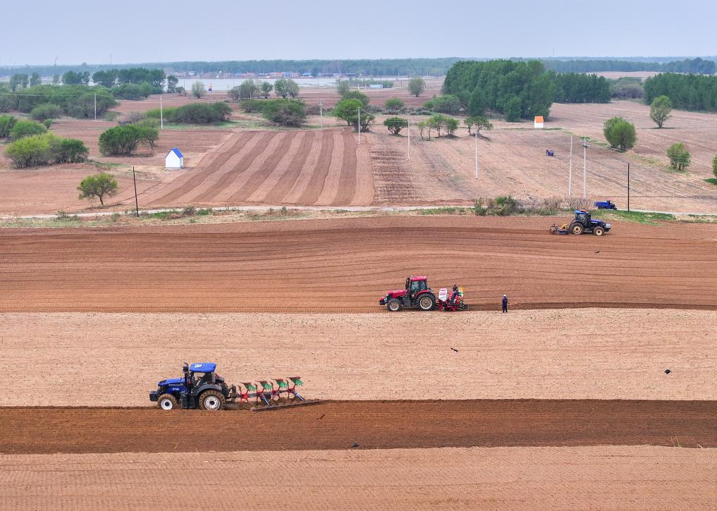 5月9日,在内蒙古通辽市科尔沁左翼后旗巴胡塔苏木伊和布拉格嘎查,农民驾驶北斗导航的拖拉机在田间耕作(无人机照片)。新华社记者连振 摄
