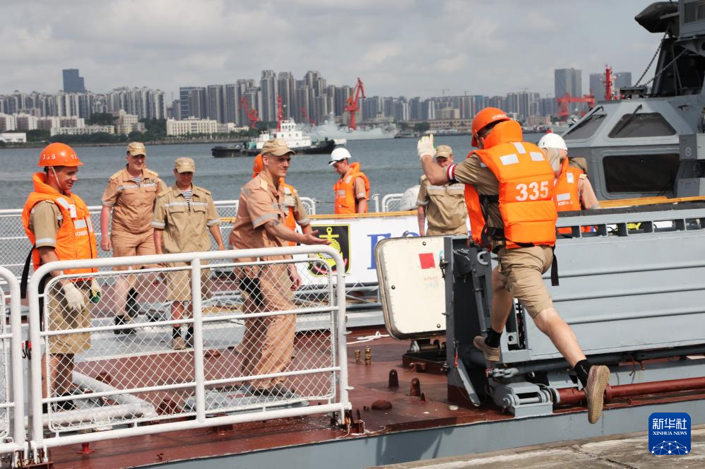 7月15日,俄“响亮”号护卫舰舰员完成撤跳板工作后返回。新华社记者 黎云 摄
