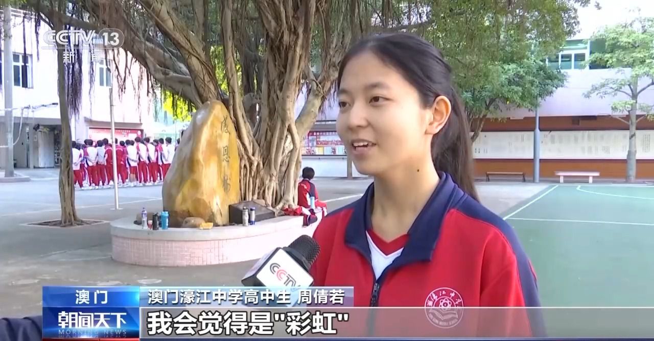澳门濠江中学高中生 周倩若:我会觉得是“彩虹”,因为彩虹是有很多颜色的,这种七彩的颜色,也代表了多彩的未来。澳门回归祖国25周年,我希望也许在下一个25周年的时候,这7个颜色的彩虹,每一条颜色由我们这一代人给它填上颜色,不管是在科技领域还是在体育方面,在各行各业都有我们这一代人的身影。我觉得当我们成长为可以由我们来书写澳门的七彩彩虹的时候,相信澳门一定是发展得更好。
