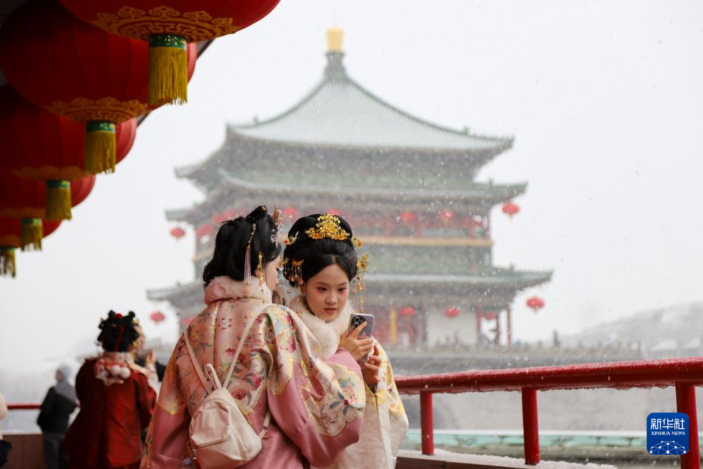 2月23日,游客在陕西省西安市钟楼旁赏雪拍照。新华社发(薛刚摄)