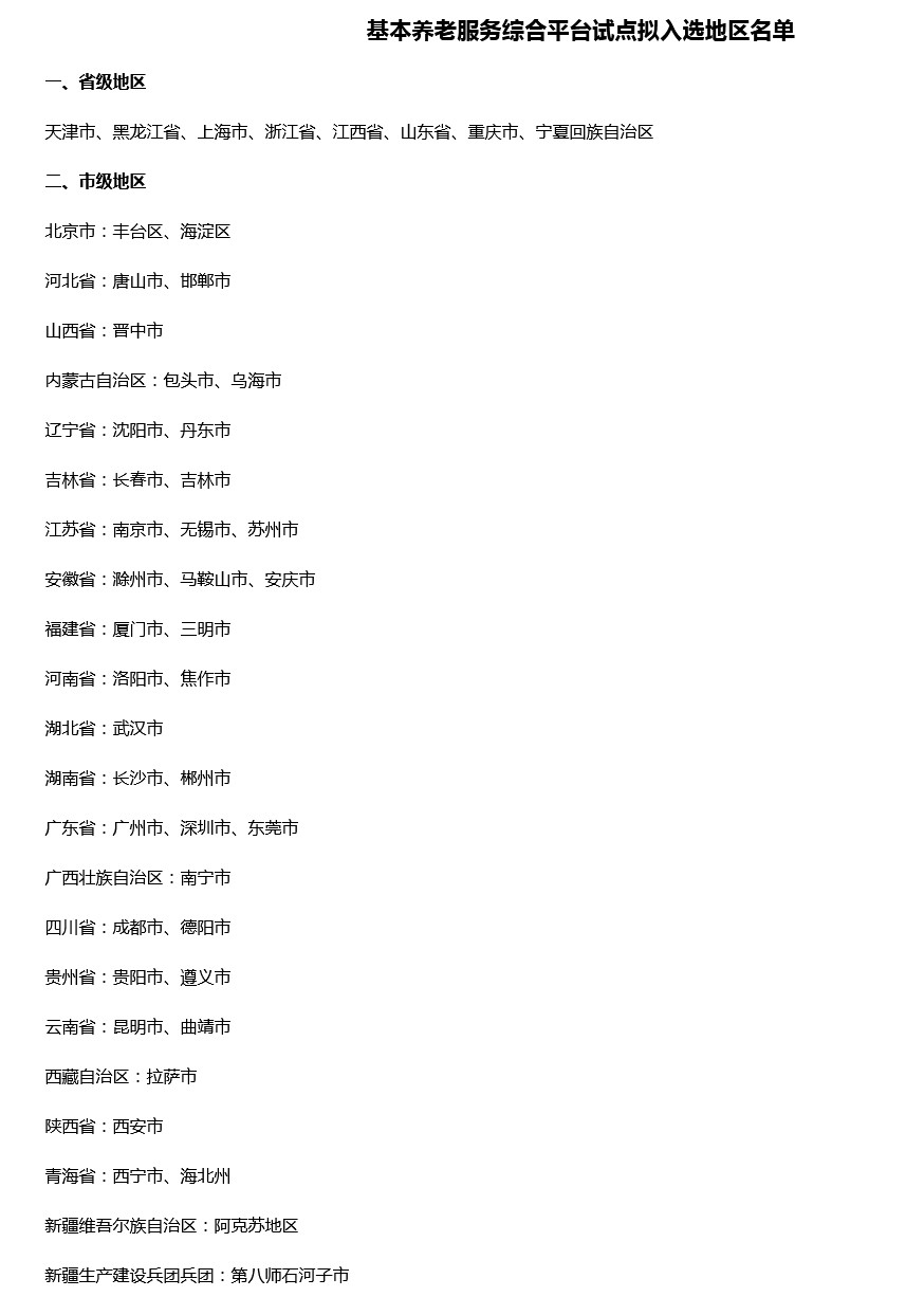 中新网4月25日电 据民政部网站消息,按照《民政部 国家数据局关于组织开展基本养老服务综合平台试点的通知》(民函〔2024〕5号)要求,经地方申报、省级相关部门推荐、专家评审,拟将天津市等48个地区作为基本养老服务综合平台试点地区。按照相关工作要求,现予以公示。公示期自2023年4月25日至4月30日,公示期满后除另有通知外,试点地区可自行开展试点工作,民政部、国家数据局将加强对试点地区的指导,确保试点工作有序有效开展。