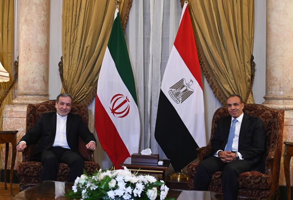 10月17日,埃及外长阿卜杜勒阿提(右)在首都开罗会见来访的伊朗外长阿拉格齐。新华社发(赛义德·穆罕默德摄)