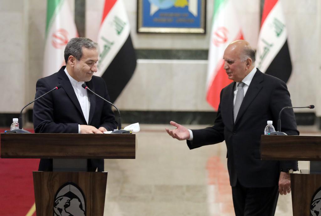 10月13日,伊拉克外长侯赛因(右)同到访的伊朗外长阿拉格齐在首都巴格达举行会谈后参加联合记者会。新华社发(哈利勒·达伍德摄)