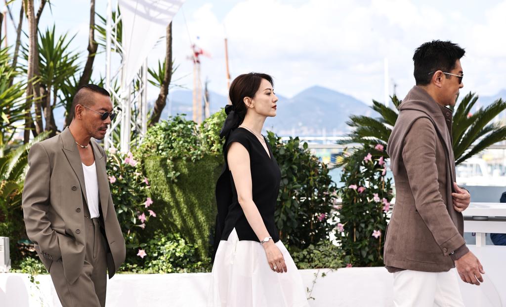 5月17日,在法国戛纳举行的第78届戛纳国际电影节上,影片《风林火山》导演麦浚龙,主演高圆圆、古天乐(从左到右)亮相拍照式。新华社记者 高静 摄