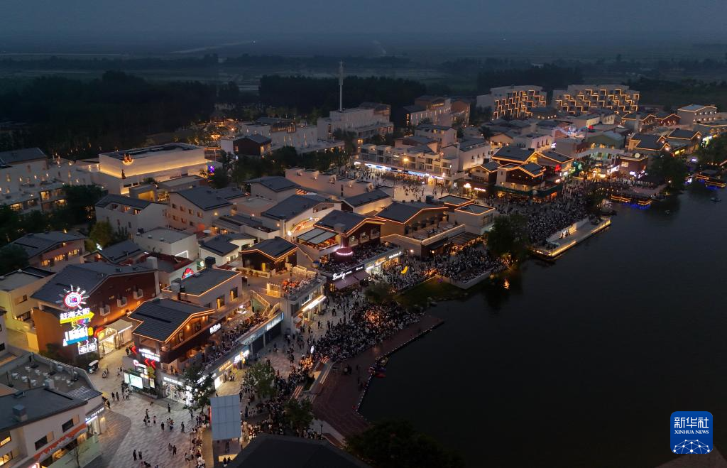 5月31日,游客在河北省秦皇岛市北戴河新区渔田七里海度假区观看杂技演出(无人机照片)。