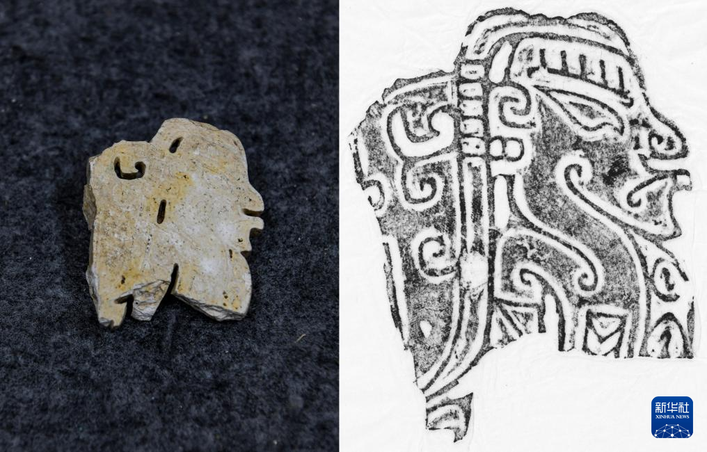 这是一张拼版照片:左图为2024年7月10日在四川省文物考古研究院拍摄的三星堆遗址出土玉石上阳刻的侧身人像(新华社记者王曦摄);右图为玉石上阳刻的侧身人像拓片(新华社发,四川省文物考古研究院供图)。新华社发