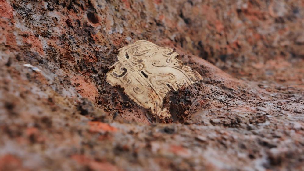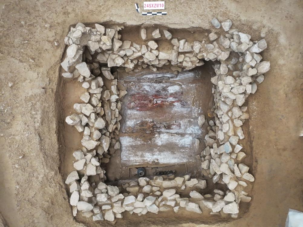 截至目前,钟村墓地共发掘5座夏商时期墓葬。其中,M10墓葬规模最大,墓中安葬的一名男性,身体涂朱,头顶覆有扇贝,左侧股骨下随葬绿松石嵌片牌饰,具有明显的二里头文化因素。
