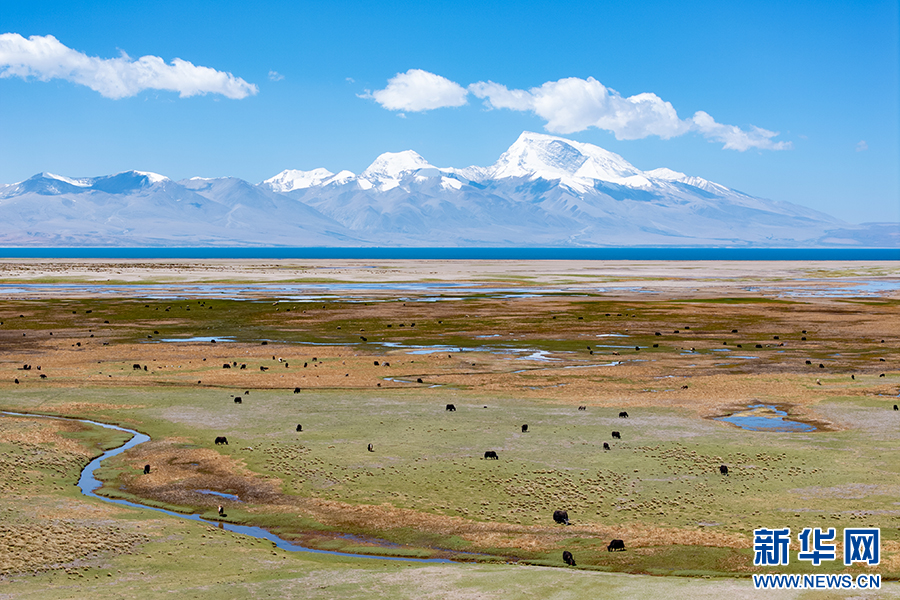 远处的玛旁雍错与湿地内觅草的牦牛(6月9日摄,无人机照片)。新华网 旦增努布 摄