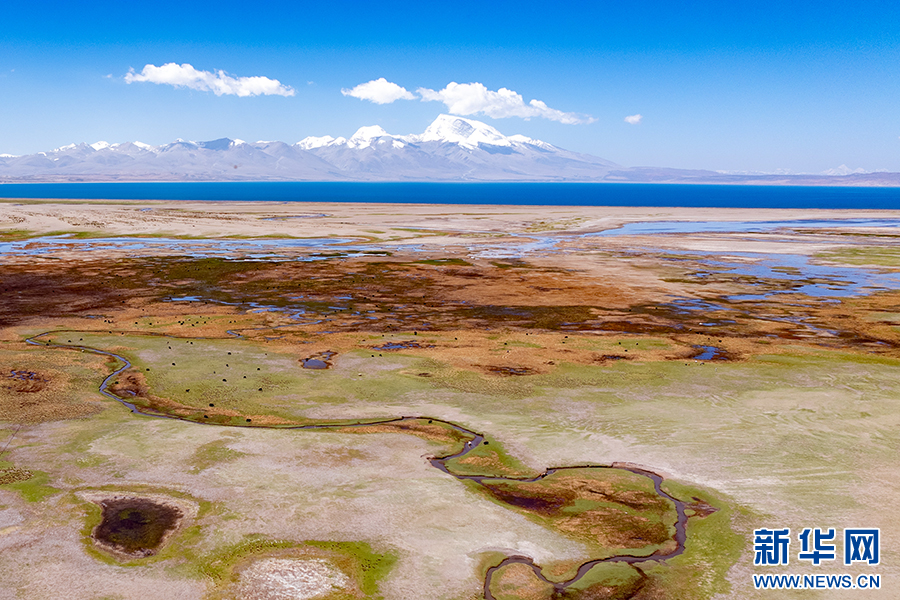 远处的玛旁雍错与绿意渐浓的湿地(6月9日摄,无人机照片)。新华网 旦增努布 摄