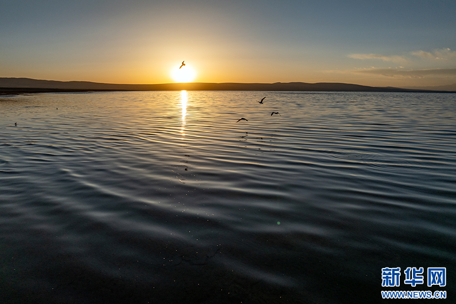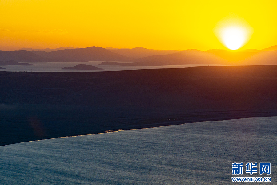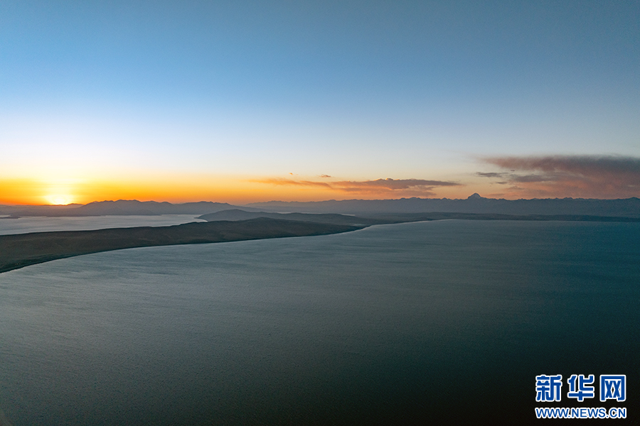 夕阳下的玛旁雍错(6月9日摄,无人机照片)。新华网 旦增努布 摄