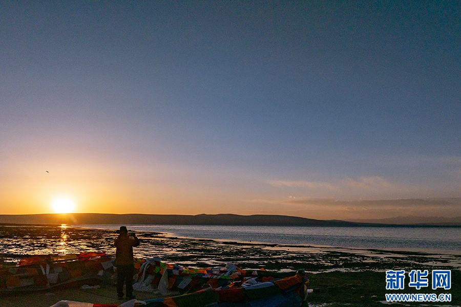 夕阳下,游客在玛旁雍错边游玩。(6月9日摄)。新华网 旦增努布 摄