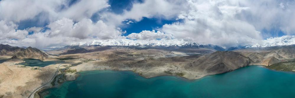 新疆帕米尔高原上公格尔九别峰和慕士塔格峰山脚下的湖泊湿地景观(2020年6月16日摄,无人机全景照片)。新华社记者 胡虎虎 摄