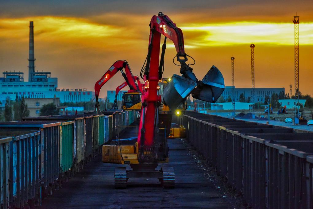 新疆霍尔果斯站换装库换十线抓料机对散堆装货物换装作业(2023年9月6日摄)。新华社记者 赵戈 摄