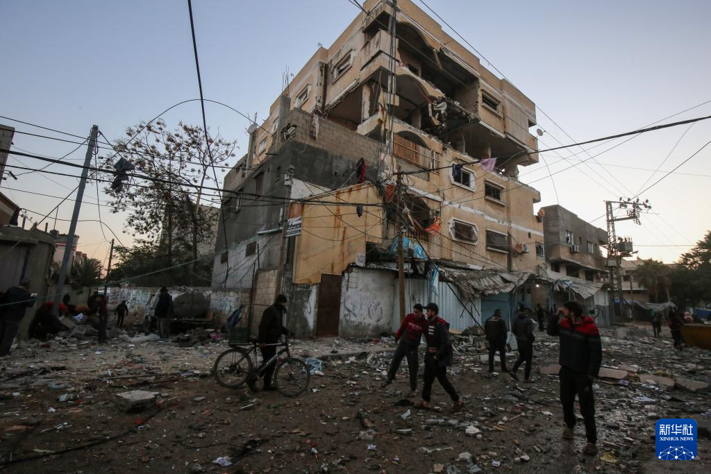 1月8日,在加沙地带中部城市代尔拜拉赫,巴勒斯坦男子从以军轰炸后的建筑旁走过。新华社发(里泽克·阿卜杜勒贾瓦德 摄)